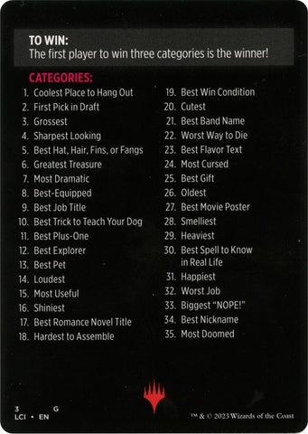 The Judge chooses a category from the list on the back of this card (either their favorite or at random). The other players each secretly submit a card from their pack that they think fits the category.
